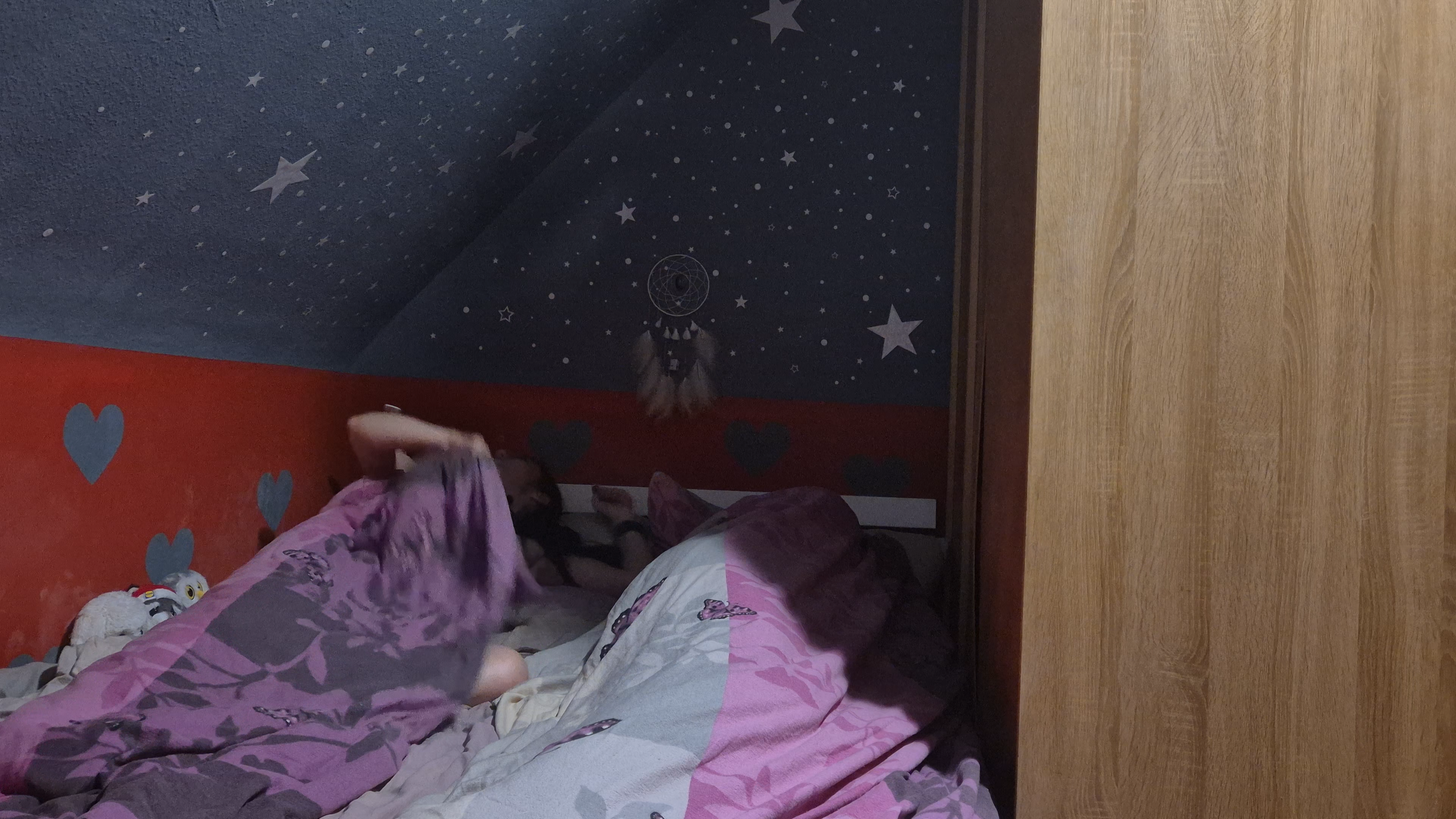 Ein Wiedersehen im Liebeszimmer: Snacks, Wein – und plötzlich ist die Fernbedienung „weg“. Vanessa rückt näher, beruhigt Natascha, streichelt ihren Hals… aus einer „Massage“ werden Küsse, flüsternde Nähe und immer tiefere Berührungen. Die Spannung kippt in pure Lust – bis Natascha die Fernbedienung findet und lächelnd beschließt: Film kann warten, jetzt zählt nur noch ihr Moment zu zweit.