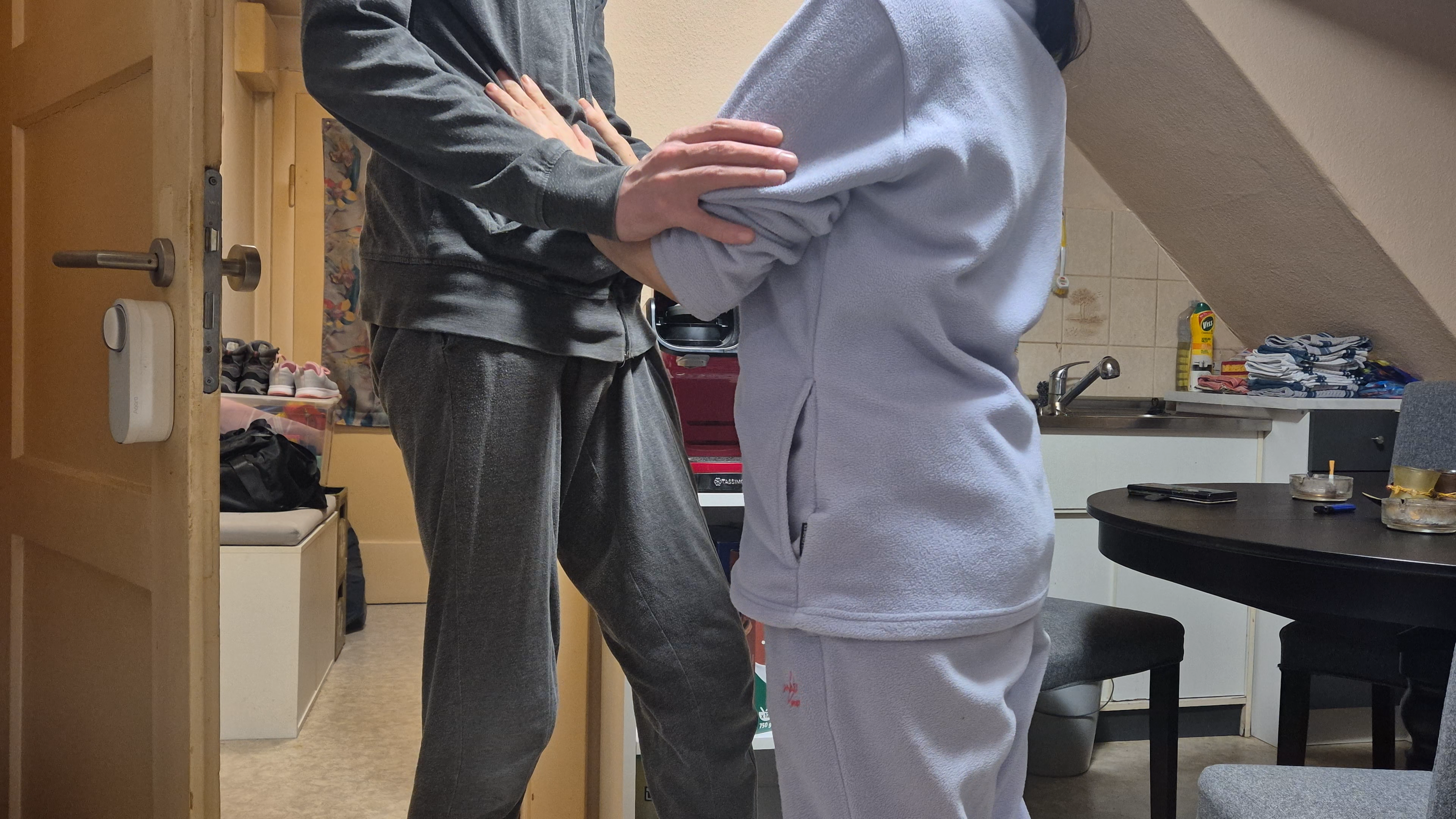Ein kurzer Call, die Tür geht auf, Natascha im Handtuch – ein Blick, ein Grinsen, das Tuch gleitet. Sie kniet sich vor ihn, baut ihn langsam auf, während er obenrum alles fallen lässt. Dann ihr Kommando: „Setz dich.“ Auf dem Boden nimmt sie ihn in ihrer Lieblingsstellung, erst sanft, dann ungeduldig– Küsse, kurze Pausen, wieder Küsse, bis beide zitternd lächeln.